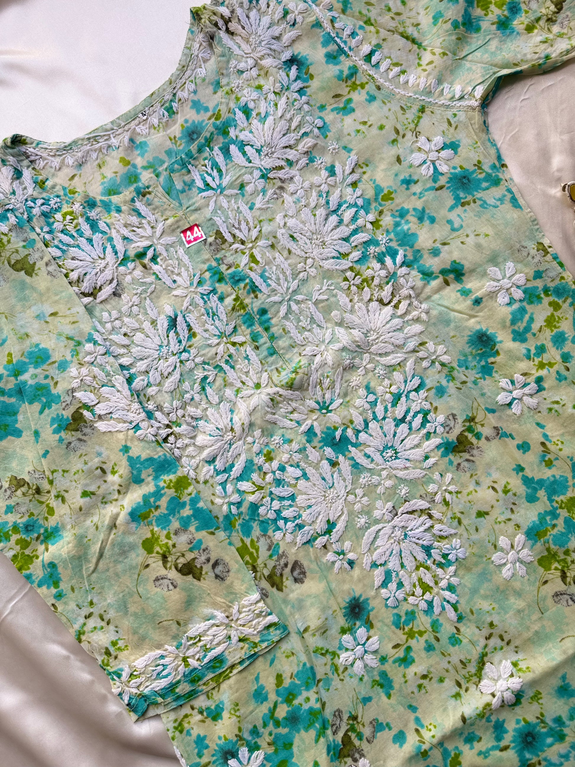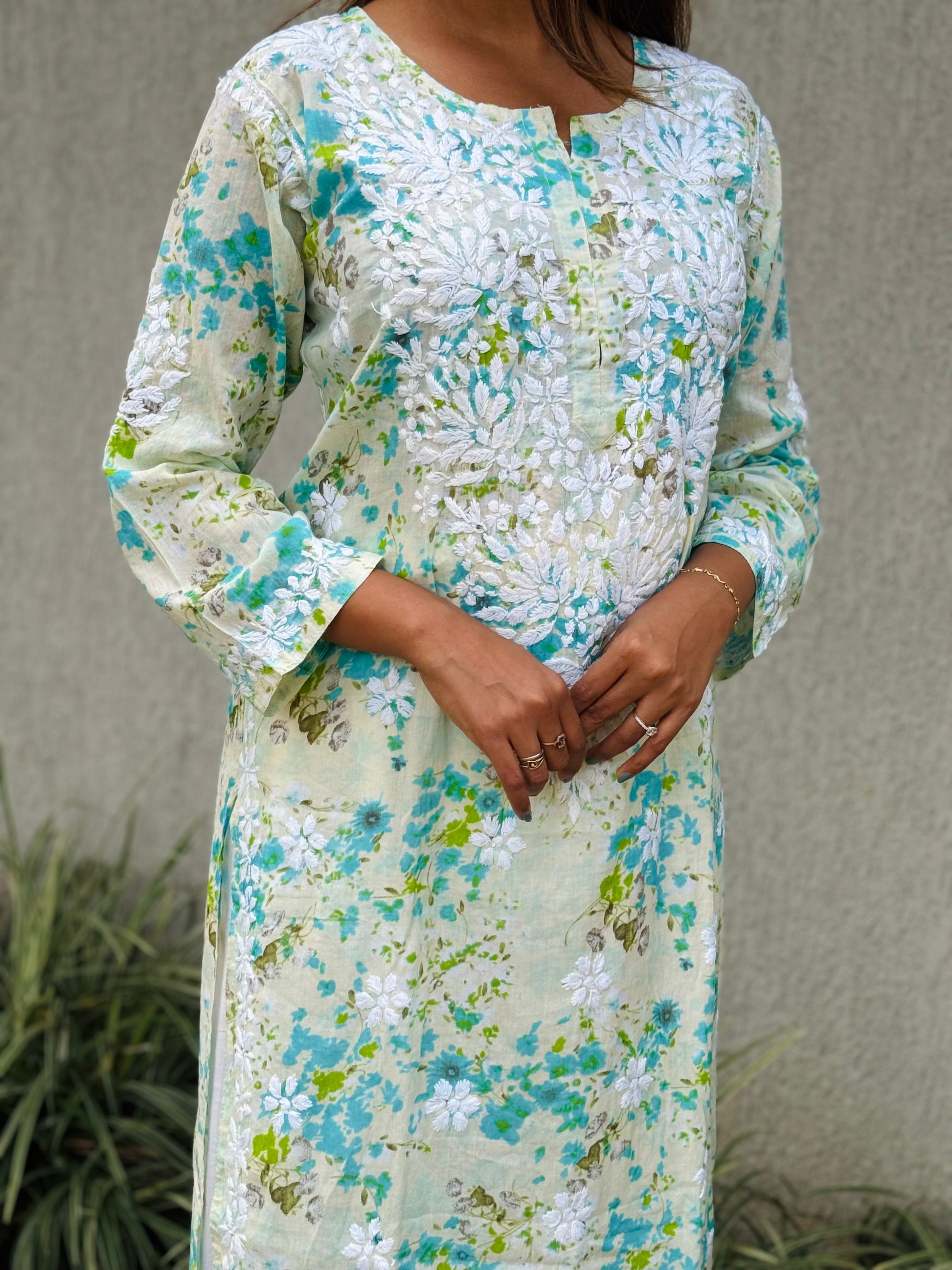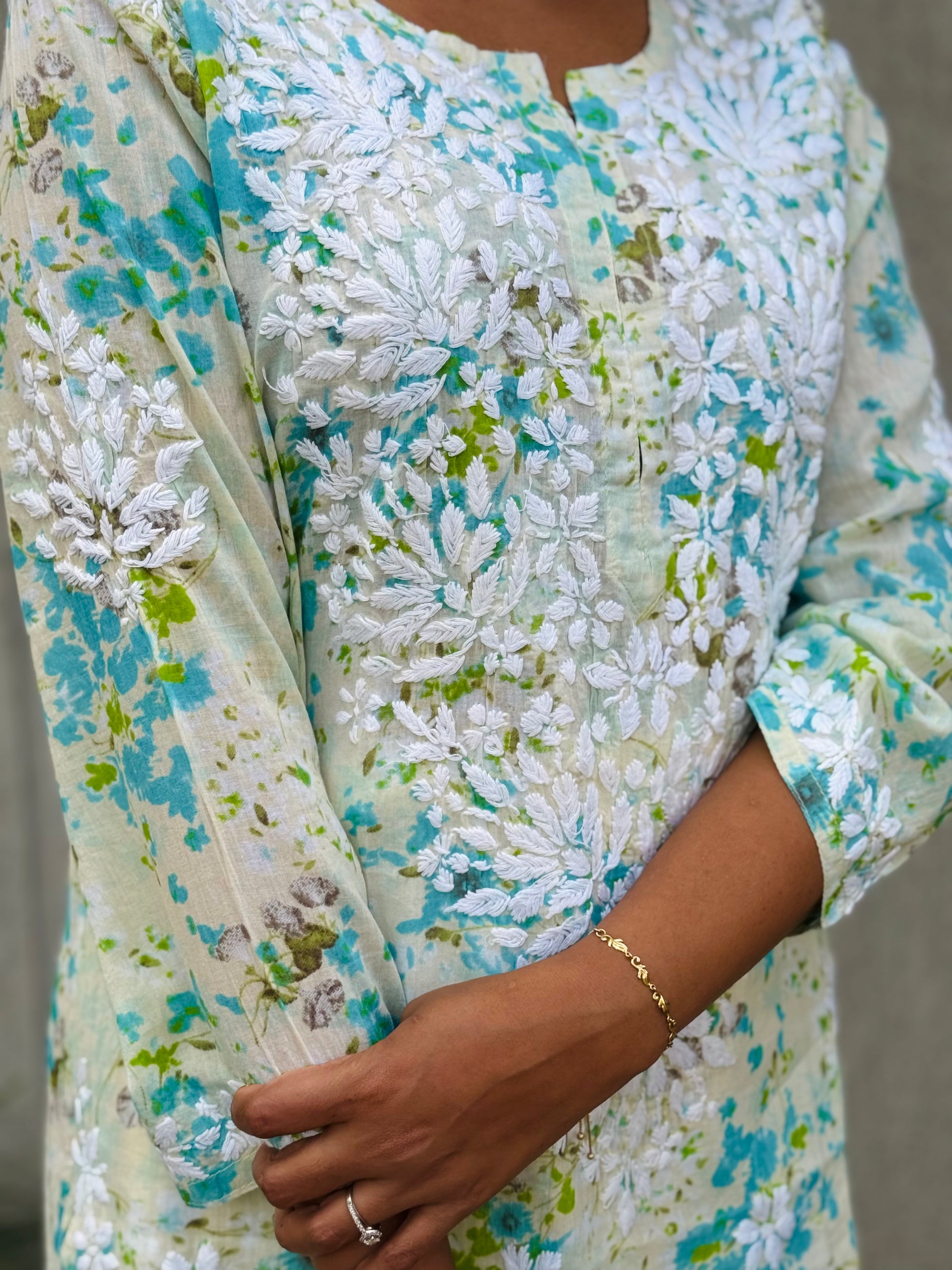 These soft mulmul chikankari kurtis, adorned with a delicate floral pattern, are a masterpiece of intricate craftsmanship. The fine chikankari work adds an elegant touch, making them effortlessly versatile. Pair them with your go-to white palazzo, classic pants, or even your favorite denim for a chic, stylish look. Whether you're heading to a casual gathering or a semi-formal affair, these kurtis are the perfect choice to elevate your style for any occasion.