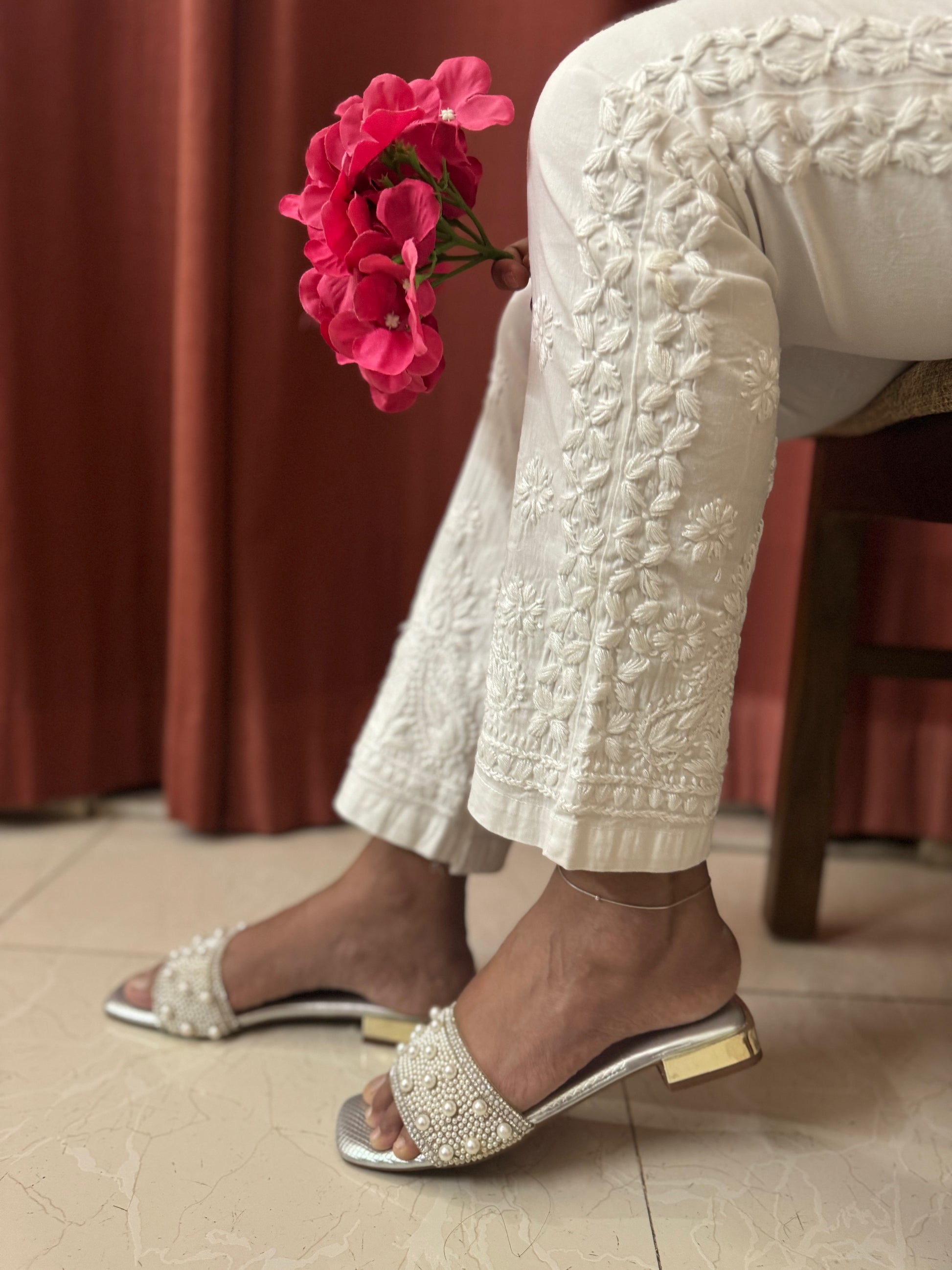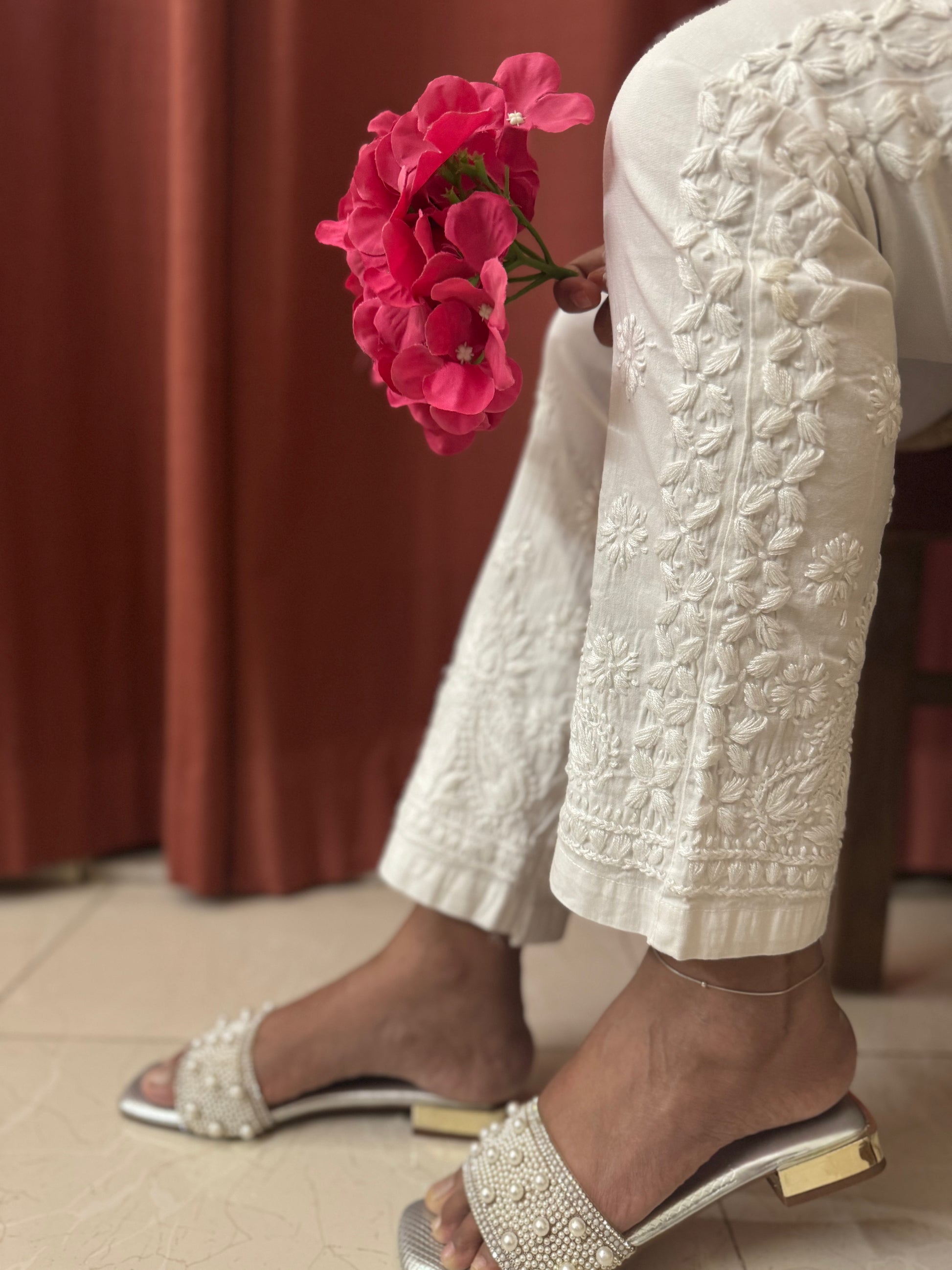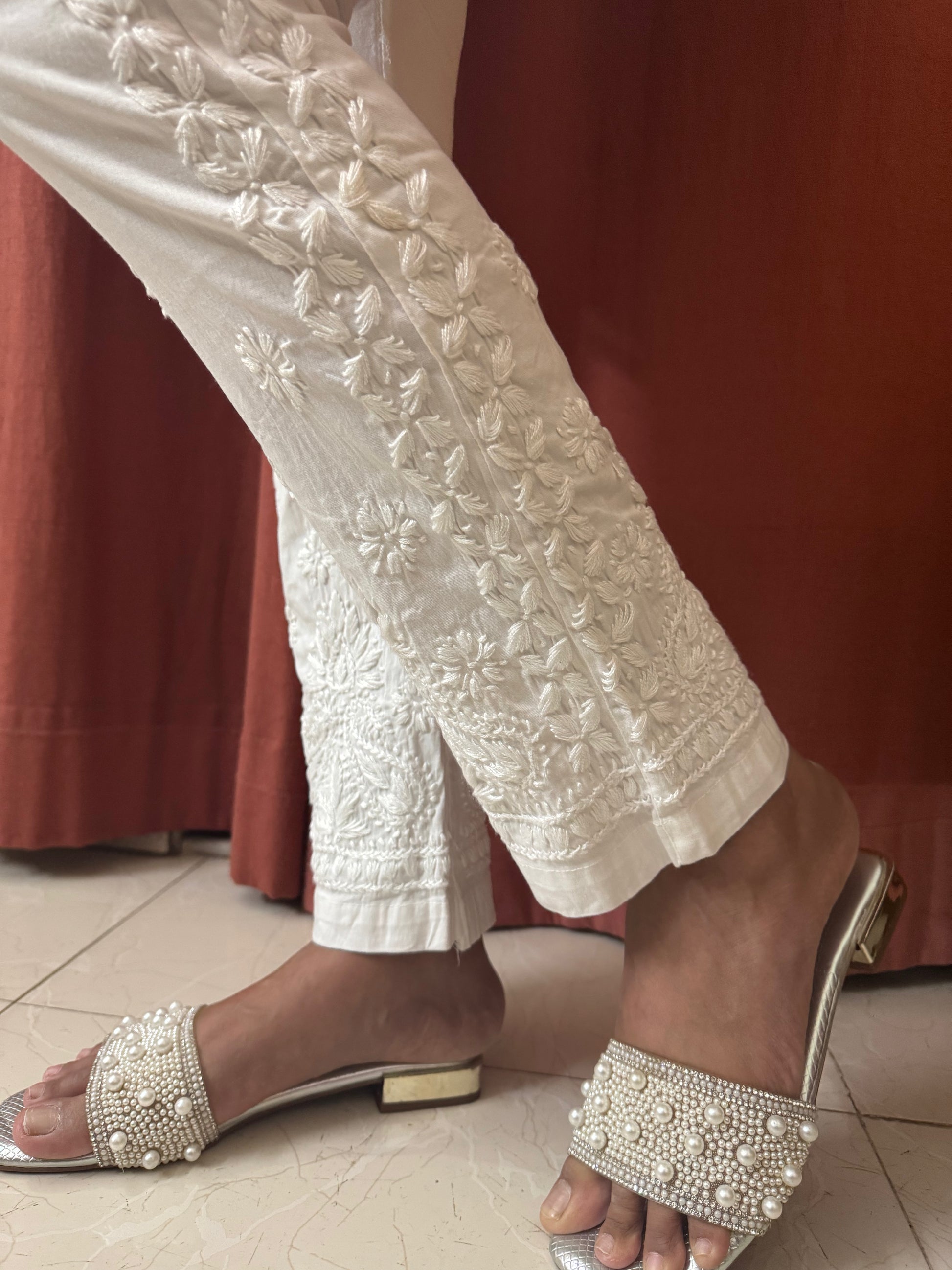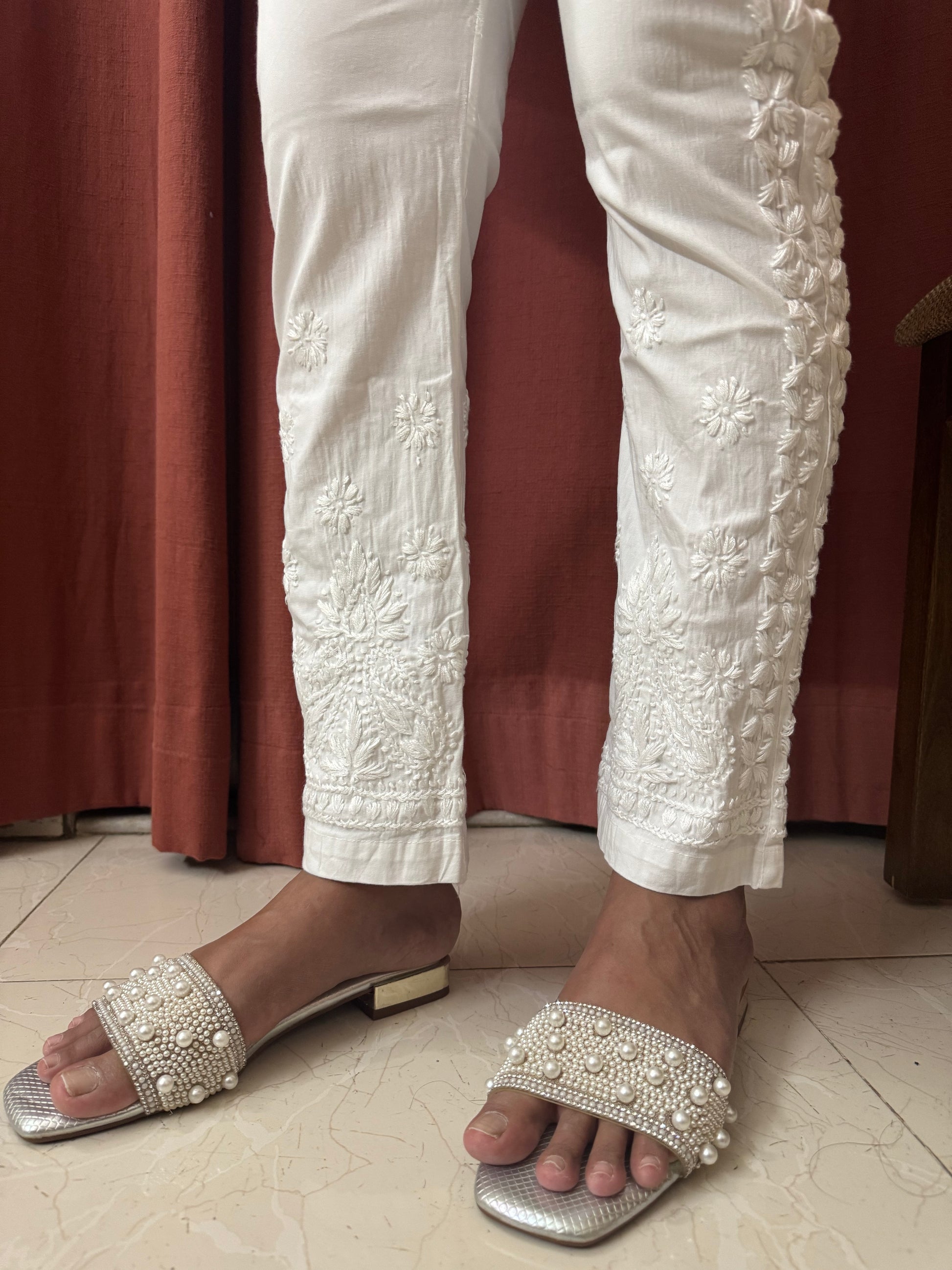 These white Cotton Lycra Stretchable Pant feature intricate chikankari handwork at the bottom, adding a touch of elegance. They are versatile and can be paired with kurtas, and more!